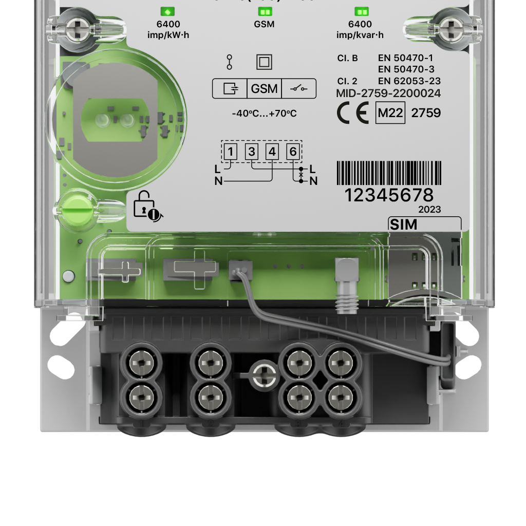 Další funkce zahrnují režim baterie, tlačítko “RESET” s možností vlastního nastavení a dvě baterie pro spolehlivý provoz. Měřič je vybaven LCD displejem s vektorovými diagramy a kódy OBIS. Bezpečnost dat je zajištěna pomocí šifrování a podporují se vzdálené aktualizace firmwaru. Obsahuje standardní terminálový blok, DIN 43857, a splňuje normy BS7856.